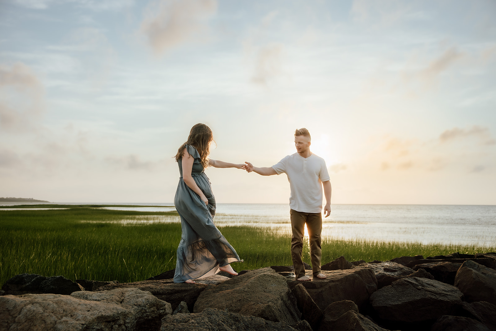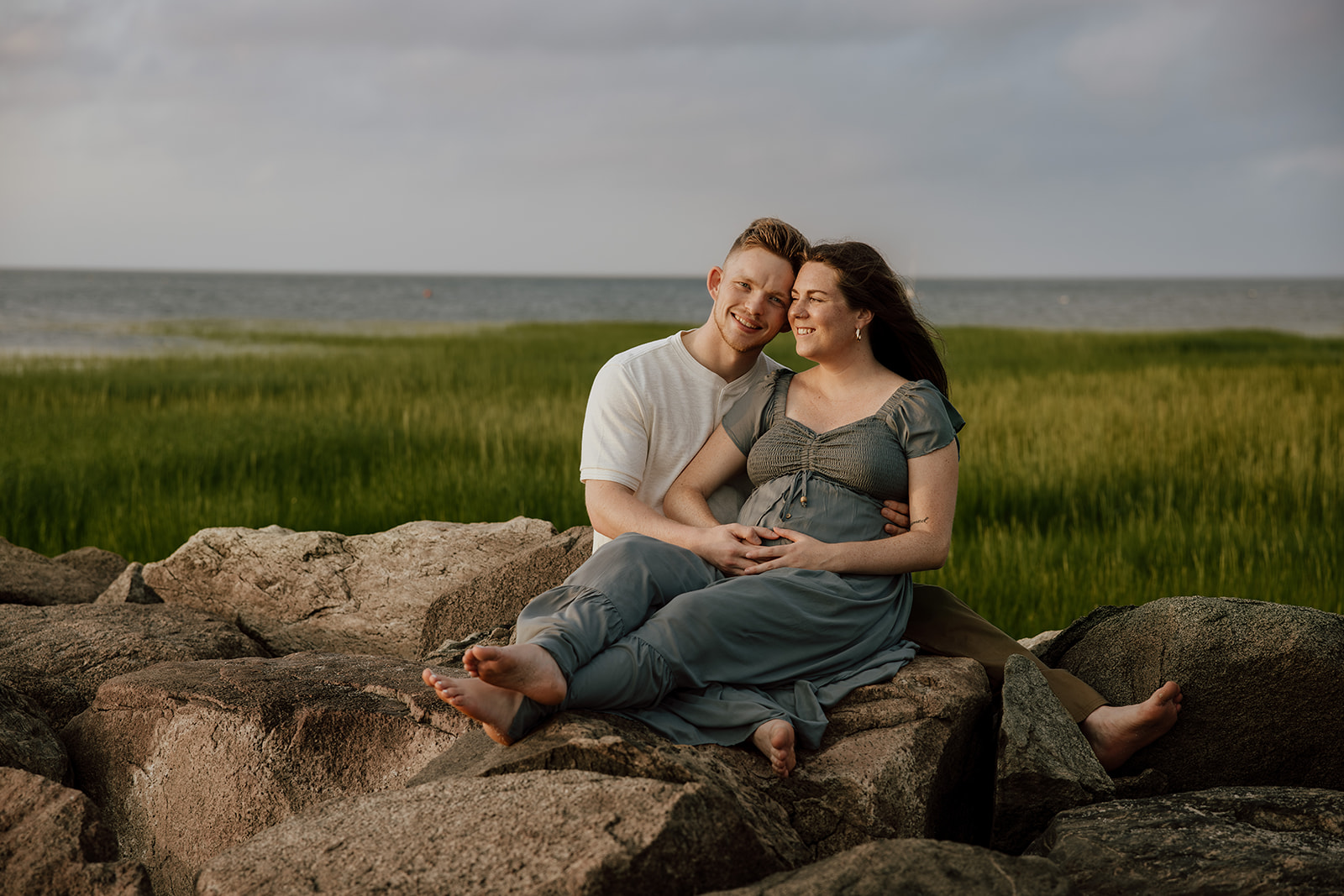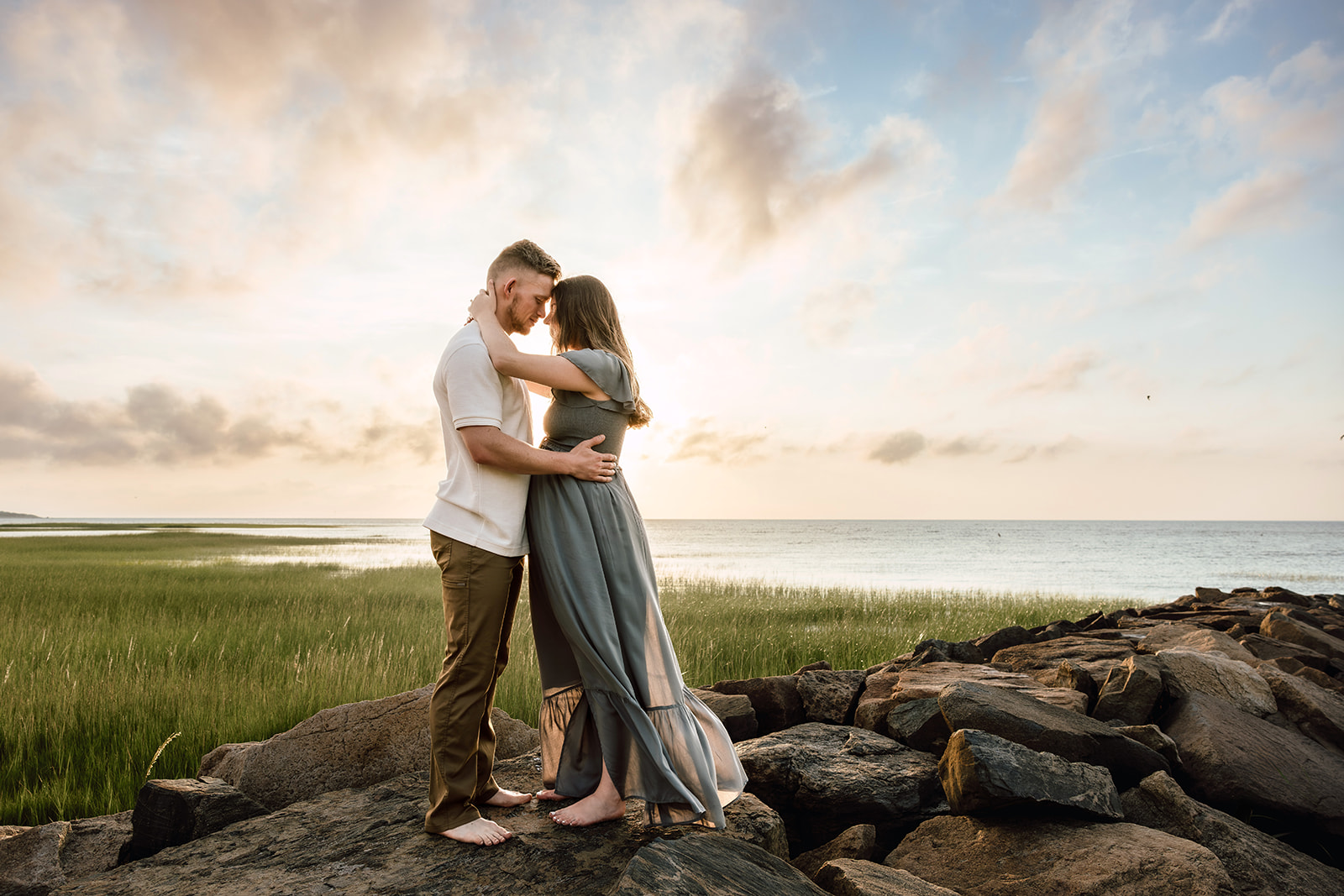 This gorgeous maternity session in Brewster MA had: a gorgeous beach with sunset, seagrass, tide pools, driftwood, rock jetty, sandy stretches… everything you could ever want! Add to that a beautiful couple, completely in love with each other and already with their baby…