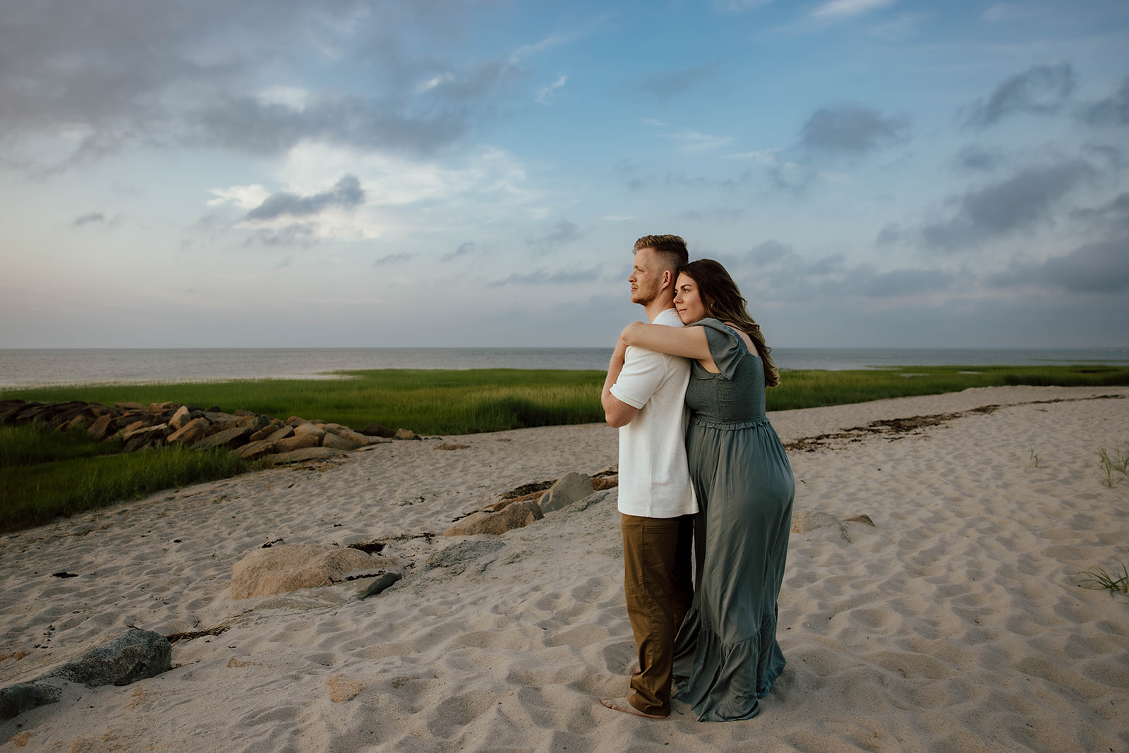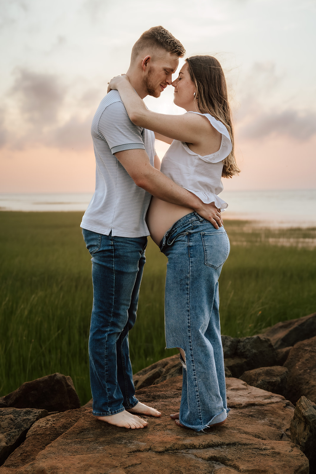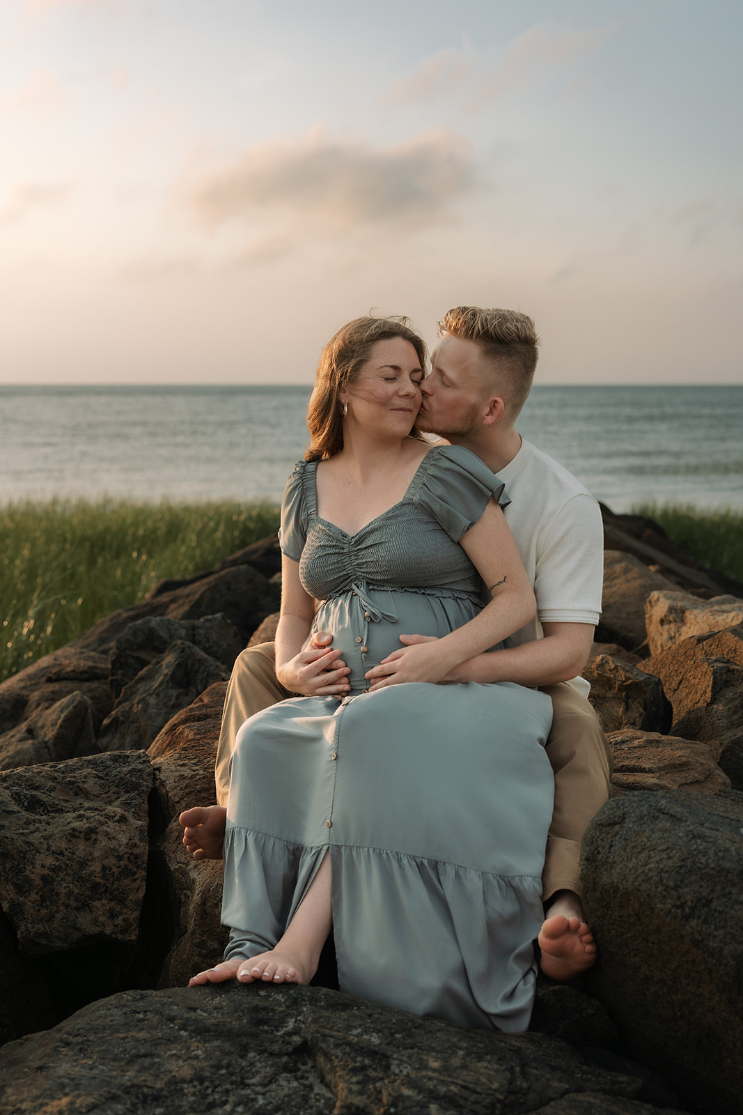 This gorgeous maternity session in Brewster MA had: a gorgeous beach with sunset, seagrass, tide pools, driftwood, rock jetty, sandy stretches… everything you could ever want! Add to that a beautiful couple, completely in love with each other and already with their baby…